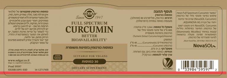תוסף התזונה כורכומין ספקטרום מבית סולגאר הינו בעל סגולות בריאותיות רבות ומבוסס על פטנט טכנולוגי ייחודי NovaSOL® Curcumin (Aquanova). החומר הפעיל כורכומין עטוף במיסלות קטנטנות בגודל ננו, מה שמאפשר לו יכולת מסיסות במים וספיגה מהירה במיוחד. זהו מוצר אשר זכה ב-4 פרסי מצוינות וטכנולוגיה יוקרתיים ומאושר כ-GRAS על ידי ה-FDA (מנהל המזון והתרופות האמריקאי).