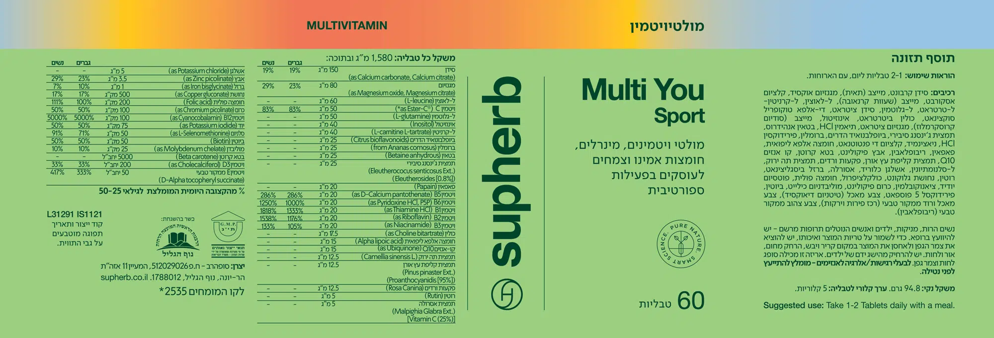 תוסף התזונה מולטי ויטמין ספורט סופהרב | Supherb Multi You Sport תוכנן במדויק עבור נשים וגברים שמנהלים אורח חיים פעיל, מתאמנים בקביעות או עוסקים בספורט מקצועי או חובבני. הפורמולה שלו מתחשבת בדרישות הייחודיות של גוף שעובר עומסים פיזיים – מחיזוק מערכת החיסון ועד תמיכה בהתאוששות השרירים.